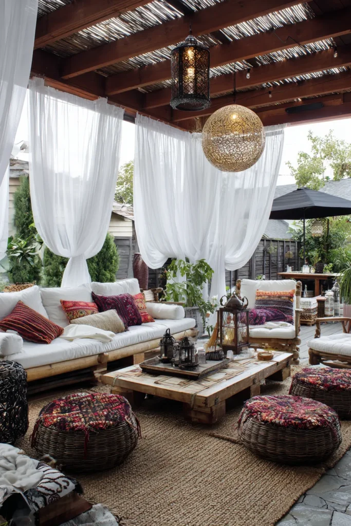 Oh my goodness, I am totally obsessed with this space because it feels like a permanent vacation spot right in your own backyard! The billowing curtains are simply magical and instantly make the area feel so private and serene, like a secret garden hideaway. I love how the vibrant pillow colors and the earthy textures of the wood and rugs come together—it’s just the perfect mix of relaxed and luxurious, making it the absolute best place to unwind after a long day!