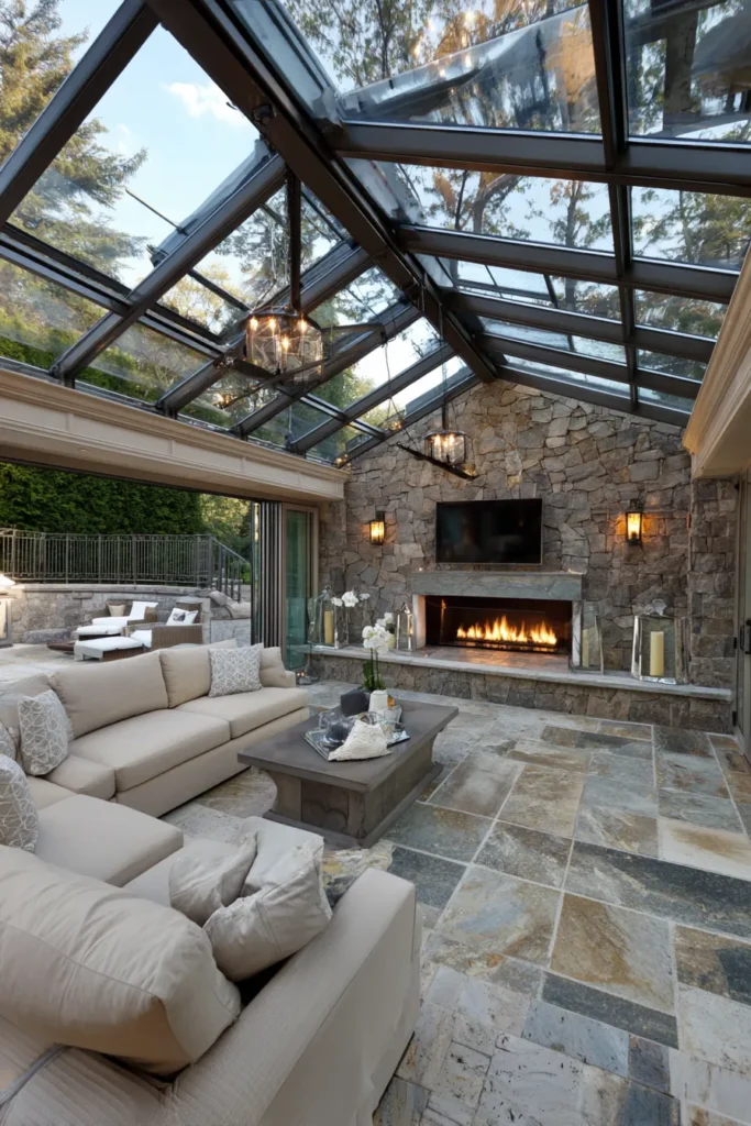 Luxe Sunroom with Stone Fireplace and Glass Ceiling