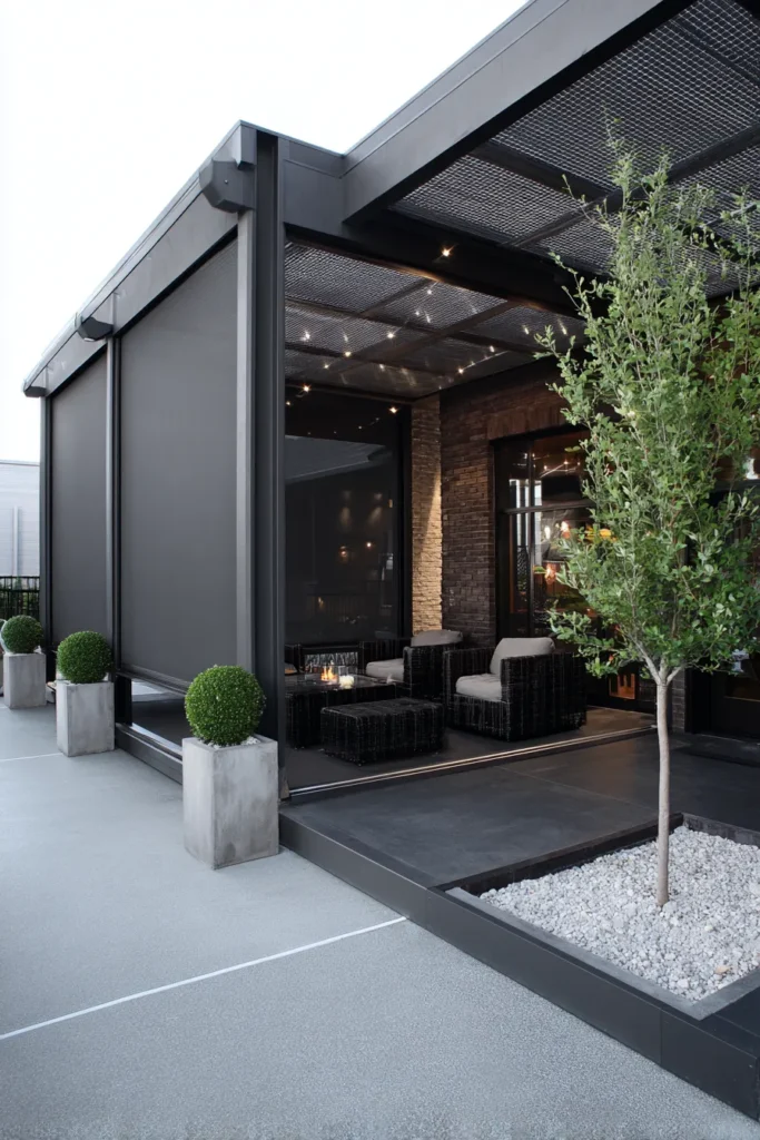 This super chic and utterly modern enclosed patio masterfully blends industrial style with ultimate flexibility. It features a sleek black metal framework and a cool mesh ceiling that lets you glimpse the sky, creating a structured yet open feel. The genius here lies in the retractable black screens that can completely enclose the space, offering total privacy and protection from the elements at a moment’s notice. Inside, there’s comfy dark wicker seating around a fire pit, and the concrete planters with perfectly trimmed topiaries add a touch of refined elegance.