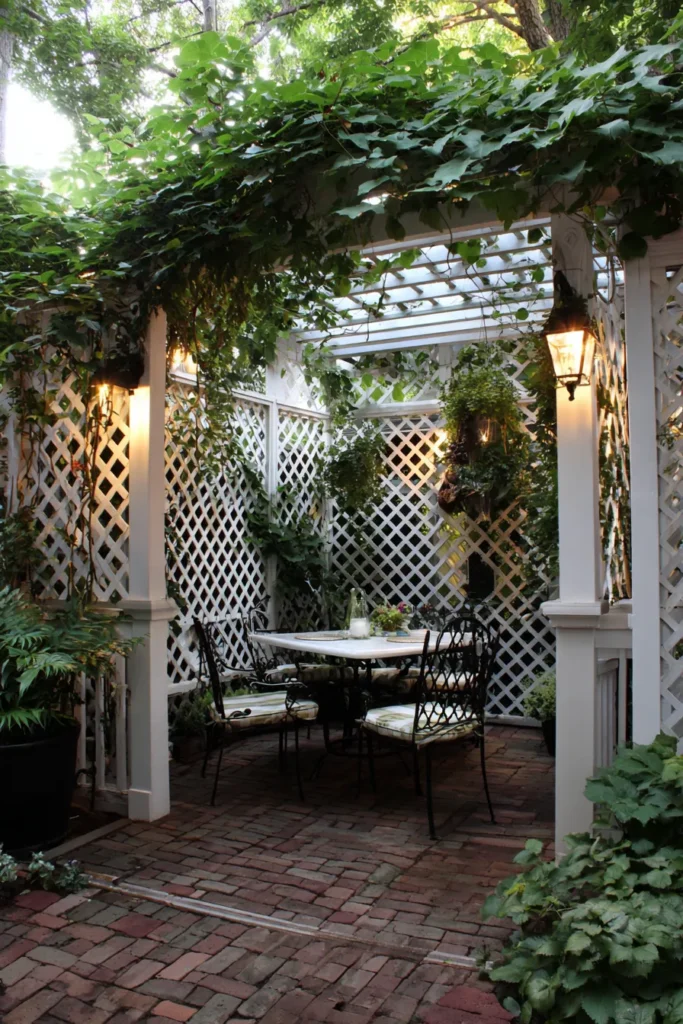 This incredibly charming patio feels like stepping into a secret garden straight out of a fairy tale! It’s enclosed by beautiful white lattice walls and a pergola overhead, which are absolutely dripping with lush, vibrant green vines that create a magical, natural canopy. Tucked inside, there’s a lovely white dining table surrounded by wrought iron chairs with pretty floral cushions, just perfect for an intimate meal. The warm glow from the lanterns and the rustic brick herringbone pattern on the floor add so much old-world charm and coziness to this wonderfully private spot.