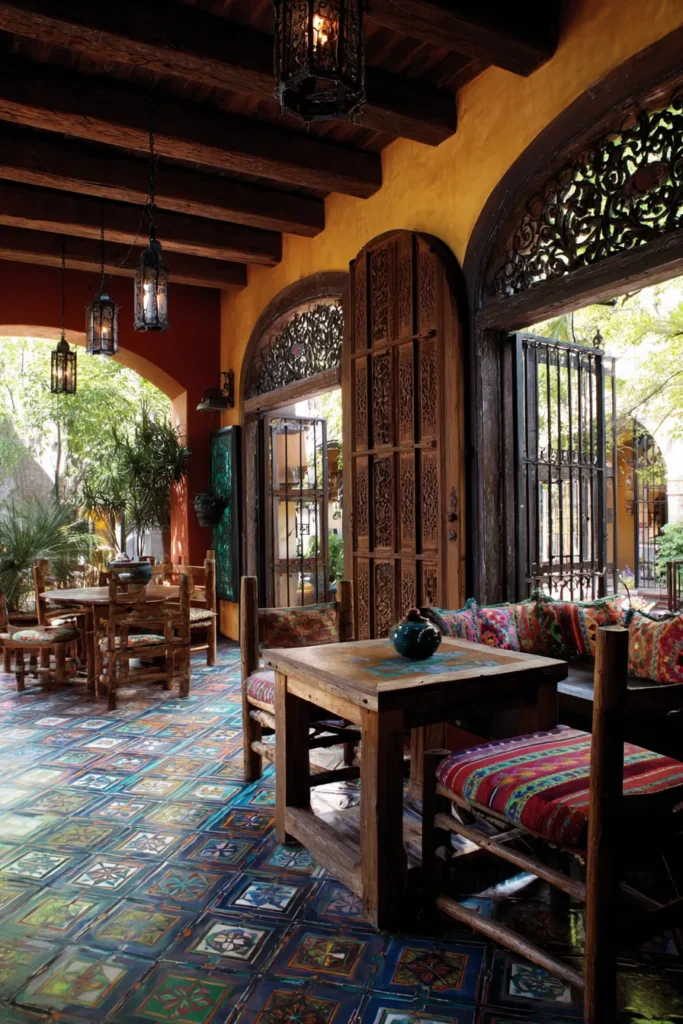 I am completely head-over-heels for the exuberant joy and warmth radiating from this design! The way those incredibly beautiful tiles burst with color against the earthy stucco and rich wood is just pure magic. Every single detail, from the carved doors to the antique lanterns, tells a story and makes the space feel so authentic and inviting. It’s truly a celebration of design that offers a wonderfully private and incredibly inspiring place to gather and enjoy life!