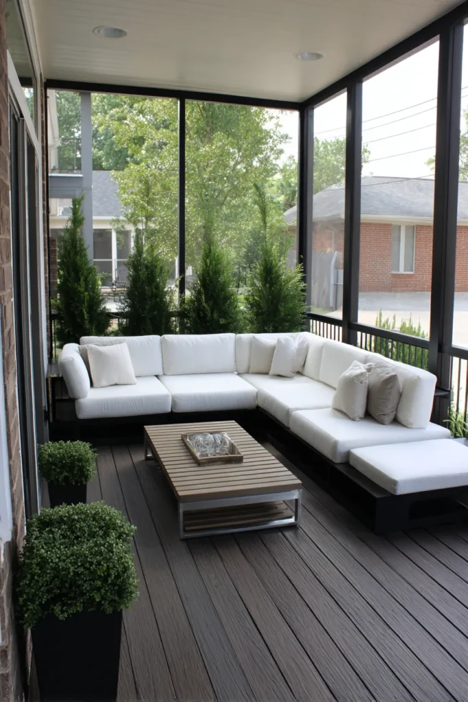 I absolutely adore how sophisticated and uncluttered this screened porch looks! The clean lines of the furniture and the minimalist color palette make the entire space feel so tranquil and high-end. Plus, the fact that you get to enjoy that beautiful outdoor view and all the fresh air without a single mosquito crash-landing on your cocktail is a total win in my book. It’s a perfect example of modern functionality meeting simple, elegant design!