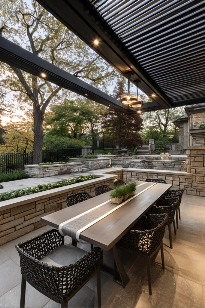 Now this is a seriously chic outdoor dining area that just screams sophisticated entertaining! The defining feature is the stunning black louvered pergola roof that can be completely adjusted to control sun, shade, or rain, which is pure genius. The long, elegant dining table is paired with contemporary black woven chairs, creating a beautiful contrast against the natural stone walls and sleek gray flooring. The surrounding stone planters and retaining walls provide both structure and a wonderful layer of privacy, making the entire space feel like a dedicated outdoor room.