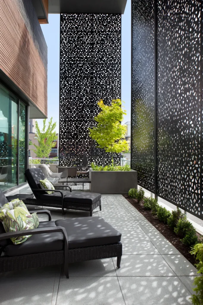 This ultra-modern patio is the definition of chic urban seclusion, using dramatic architectural panels to create its enclosure. The stunning laser-cut black metal screens are the star of the show, providing incredibly stylish privacy while casting intricate, dappled shadow patterns onto the light gray flooring. The rest of the space keeps it sleek and comfortable with dark loungers, clean lines, and simple planters holding vibrant green trees, which pop beautifully against the black structure. This is high-design outdoor living at its absolute finest!