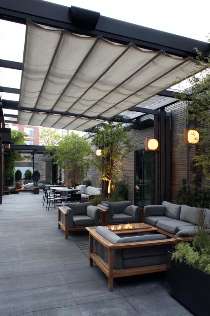 This massive, ultra-stylish outdoor courtyard is designed for both large-scale lounging and entertaining, featuring a structured, industrial feel with an incredibly practical enclosure. The space is topped with a black metal frame and a huge retractable fabric awning, which can be pulled back or extended to control the amount of sun and shade. The aesthetic is clean and modern, defined by smooth gray stone flooring, long modular gray sofas, and geometric lighting fixtures. Large trees and planters are incorporated throughout the space, bringing an essential touch of organic life to the contemporary hardscaping.
