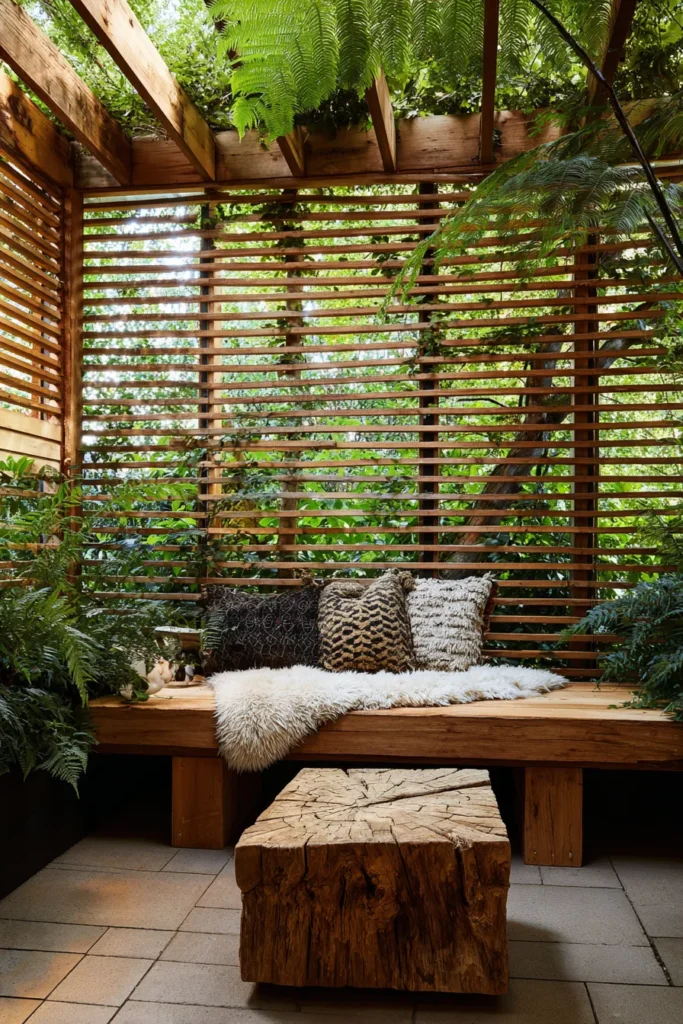 This delightful enclosed space is a true woodland sanctuary that completely immerses you in nature while offering incredible privacy. The entire structure is built from warm, beautiful natural wood slats, forming walls and a pergola roof that allows sunlight to filter through. The enclosure is softened and enhanced by lush, trailing ferns and climbing vines that spill down from the roof and peek through the slatted walls, creating a vibrant, living green barrier. A cozy wooden bench is topped with earthy, textured pillows and a soft fur throw, completing this organic, spa-like escape.