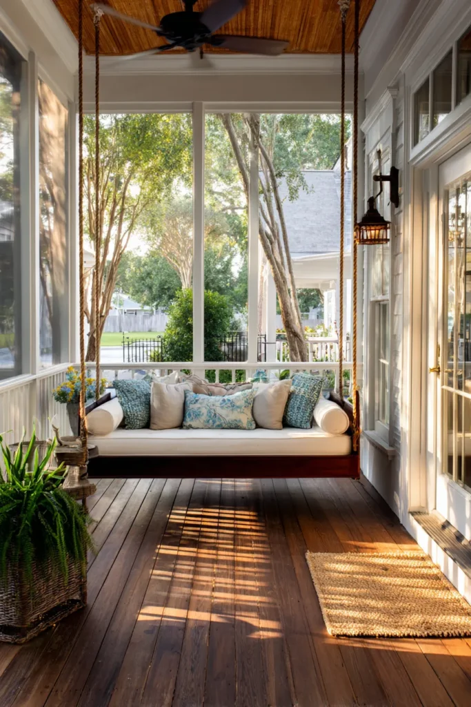 This design is pure Southern charm and relaxation, elevating the classic screened-in porch with a dreamy swing bed as its centerpiece. The porch itself features a warm, rich wood floor and a gorgeous tongue-and-groove wood ceiling, which adds so much architectural character. The enclosure is traditional screening, giving you bug-free comfort and lovely views of the yard. The swing is piled high with beautiful coastal blue and white pillows, creating the most inviting spot for napping or reading.