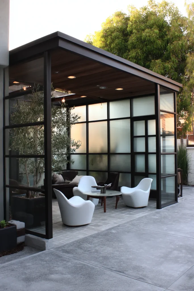 This is such a sleek and sophisticated take on a modern enclosed patio! The design is defined by its black metal frame structure and a brilliant use of both clear and frosted glass panels to manage light and privacy. The frosted panels are the key here, letting soft light filter through while completely obscuring the view of the neighbors. Inside, the furniture is just as sharp, featuring minimalist white sculptural chairs and an olive tree planted right into a large black planter, which brings a beautiful natural element to the sleek, defined space.