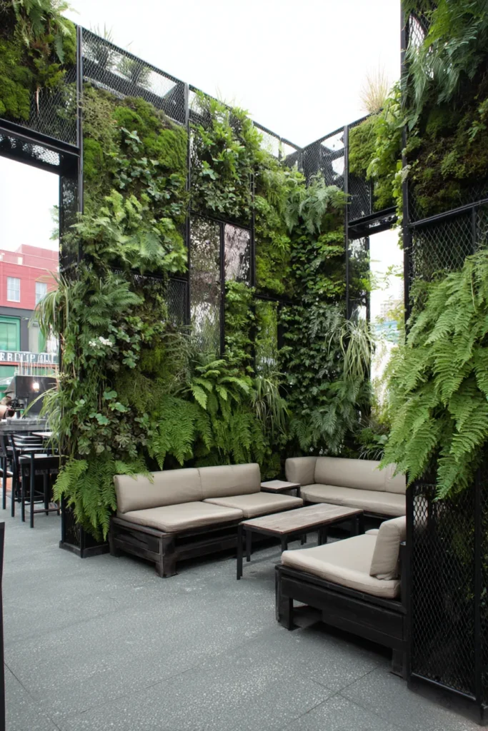 Wow, this design is absolutely breathtaking and such a dramatic way to create instant privacy and a green oasis! I am totally obsessed with the idea of being surrounded by those incredible living walls—it feels like escaping into a super exclusive, hidden jungle. The contrast between the sleek, dark furniture and the wild, organic greenery is just so striking and sophisticated. It’s a brilliant idea for anyone who wants an enclosed patio that is high-style, private, and feels completely immersed in nature!