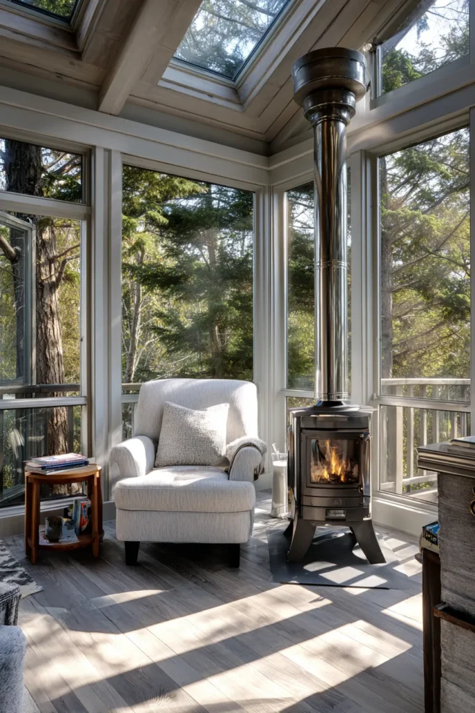 Four-Season Sunroom with Cozy Wood-Burning Stove