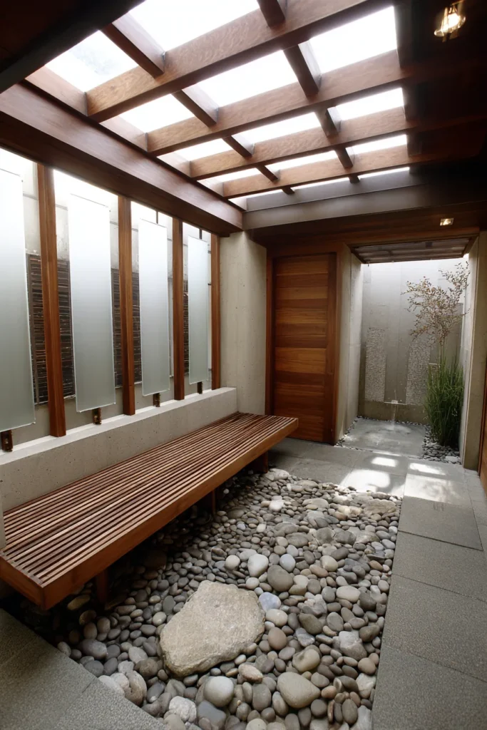This stunning enclosed space serves as a modern, Zen-inspired transition area—a beautiful bridge between indoors and out. It’s a masterful blend of warm natural materials and clean, minimalist architecture. The focal point is the long, slatted cedar wood bench that sits over a bed of smooth, rounded river stones, creating a natural, contemplative space. Privacy is elegantly managed by tall, vertical glass panels with a frosted finish, which filter the light and obscure the view while letting the warm wood of the ceiling and door shine.