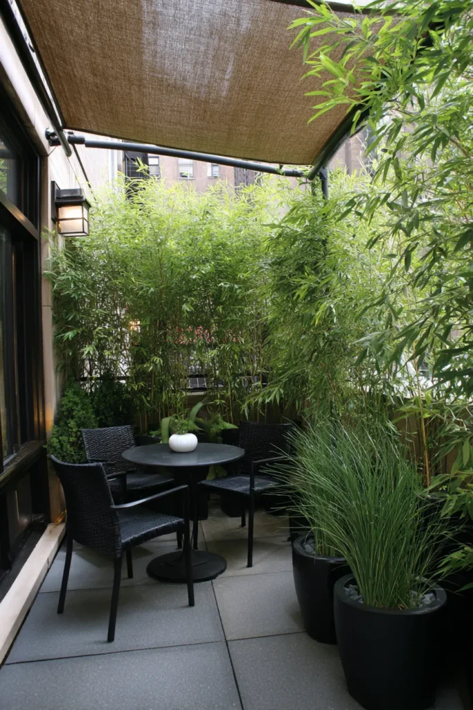 If you’re dreaming of a peaceful, private sanctuary, this design is the one to copy because it uses living bamboo plants to create the most incredible green enclosure. The floor is covered in sleek gray pavers, which contrast beautifully with the texture of the thick, tall bamboo plants that form a dense, vibrant green wall of privacy. There’s a cozy little black bistro set nestled amongst the greenery, and a simple woven natural material provides overhead shade, making the space feel like a totally secluded, mini urban jungle escape.