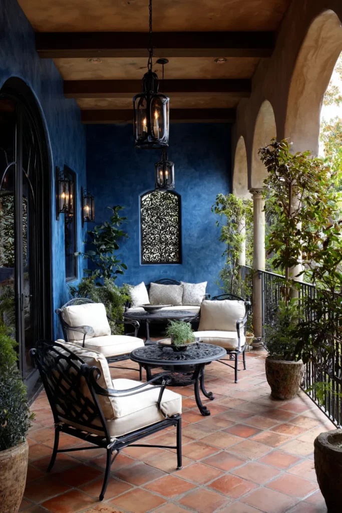 This gorgeous design whisks you away to a sun-drenched European villa with its rich, Mediterranean-inspired architecture and colors. The space is defined by a deep indigo textured wall, stunning archways with stucco finishes, and a warm terracotta tile floor that brings so much character and a touch of rustic charm. The furniture is classic wrought iron with plush cream cushions, and the look is completed with dramatic black lanterns hanging from dark wood ceiling beams, along with tall, lush greenery that spills over the wrought iron railing, all creating a wonderfully intimate enclosure.