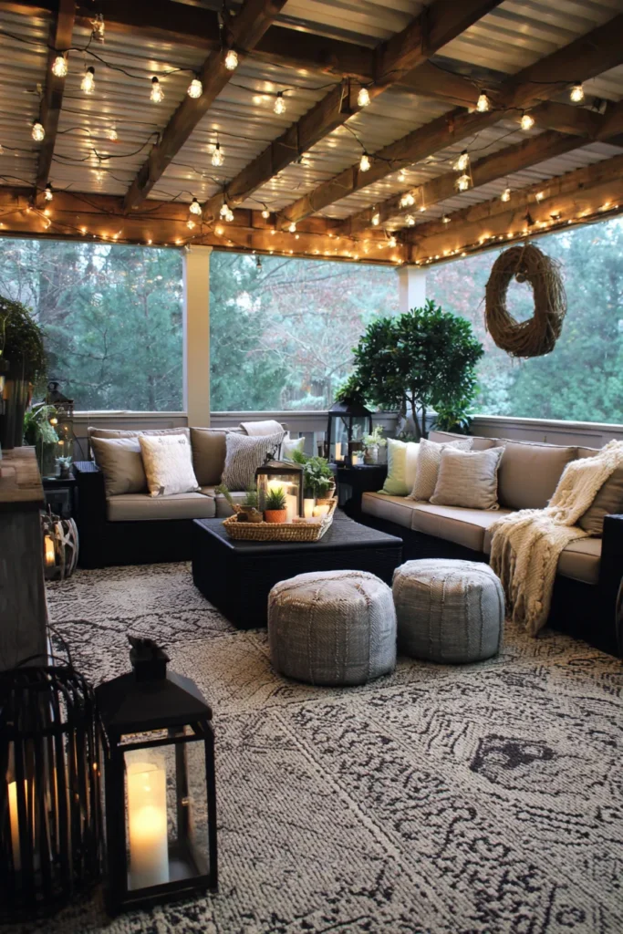 Talk about a cozy haven—this enclosed porch is the ultimate spot for year-round lounging and looks like it belongs on the cover of a design magazine! It features a huge sectional sofa with plush taupe cushions and mountains of cozy pillows in neutral shades and creamy whites, all grounded by a beautiful black and white patterned outdoor rug. The roof has exposed wood beams and a corrugated metal ceiling, giving it that perfect rustic-meets-industrial feel. But the best part has to be the hundreds of twinkling string lights draped across the ceiling, casting the most magical, inviting glow.