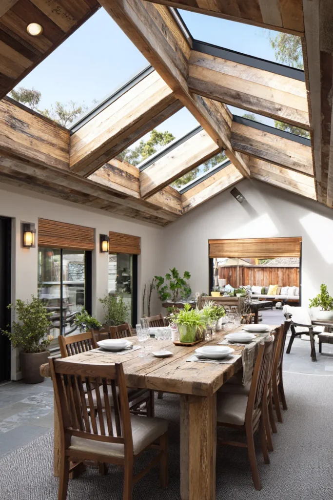 I am obsessed with the way the natural light pours in through those incredible wood-framed skylights—it truly turns this into a showstopper of a room! The use of rustic wood against the clean white walls and the dark gray flooring is such a wonderful contrast, making the whole space feel so much more elevated. It’s a wonderful design that gives you all the feels of dining outdoors, but you get to enjoy the comfort of being protected from the elements!