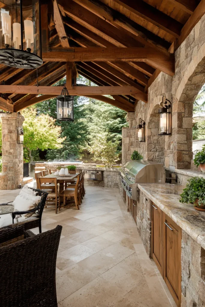 This is what I call luxurious outdoor living—a truly grand covered loggia featuring incredible rough-cut stone columns and walls built with beautiful arches. The ceiling is a masterpiece of exposed heavy timber beams, creating a rich and warm contrast to the light, smooth stone tile floor. This space functions as a full outdoor kitchen and dining room, complete with sleek granite countertops, an impressive built-in grill, and hanging lanterns that add a touch of old-world elegance. It’s the perfect extension for entertaining on a grand scale.