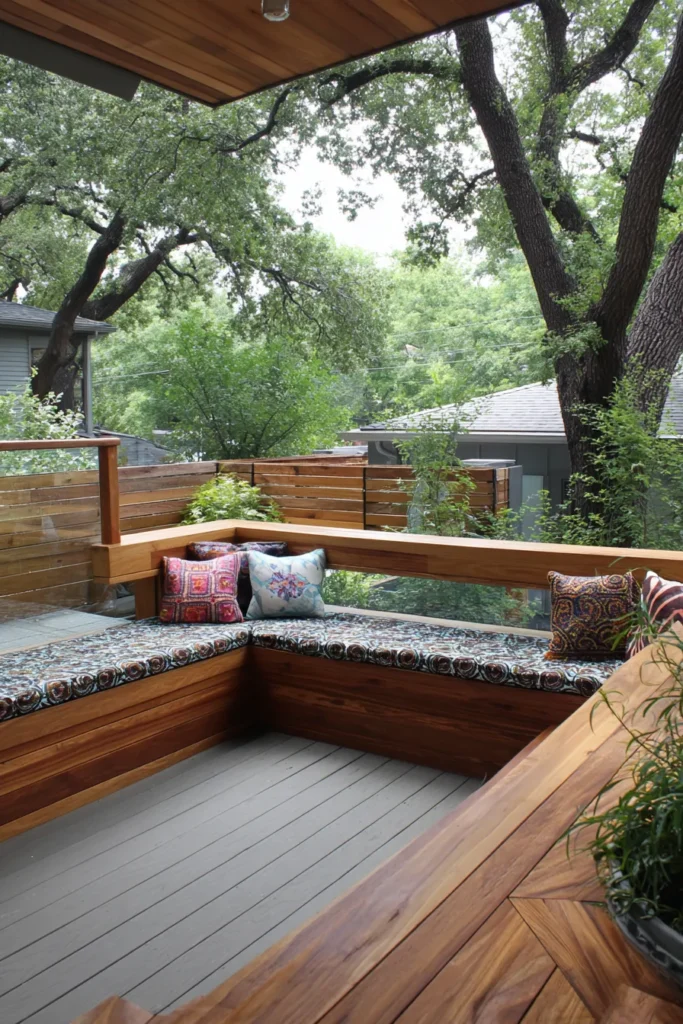 This contemporary deck offers such a clever and incredibly stylish solution for creating a private little outdoor lounge area. It features gorgeous built-in bench seating constructed from rich, warm wood with a striking patterned cushion that instantly adds a pop of color and personality. The privacy comes from a combination of a low horizontal wood slat fence and modern glass panels, which let you enjoy the view of the lush trees while still feeling perfectly secluded. It’s the ultimate smart design for maximizing comfort and style in a compact space.