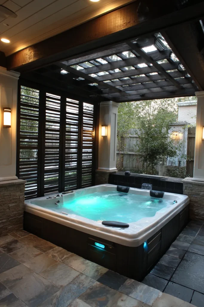 This stunning enclosed space is dedicated to total relaxation, featuring a gorgeous built-in spa or hot tub that looks like it belongs in a five-star resort. The enclosure is all about sophisticated privacy, using dark horizontal louvered screens on the walls that provide complete seclusion while still letting light and air filter through. The dark, rich wood of the pergola ceiling and the chunky stone tile flooring create this deeply grounding, earthy feel. It’s all framed by classic white columns and accent lighting, giving it a cozy, warm, and inviting glow.