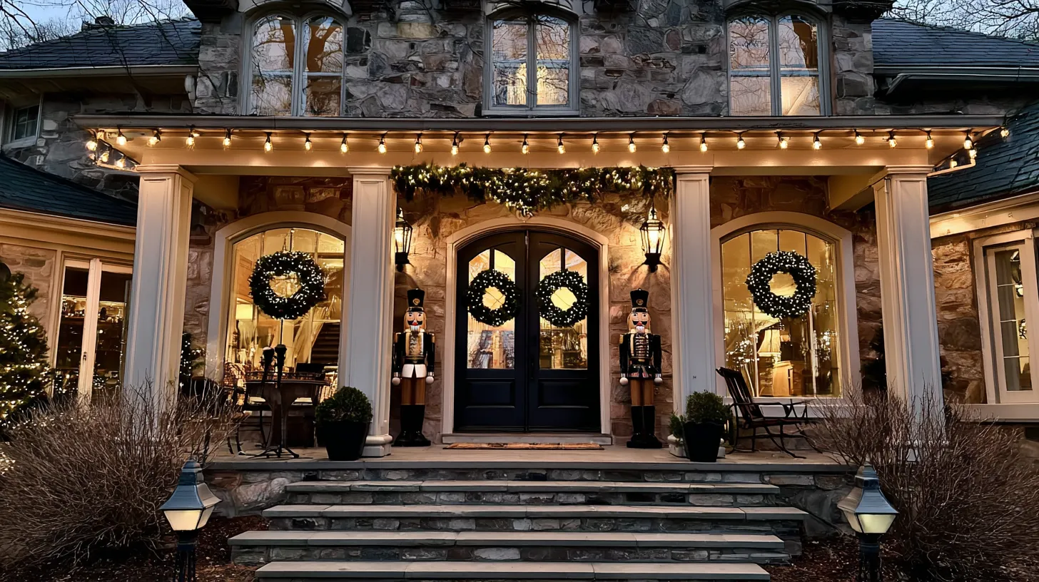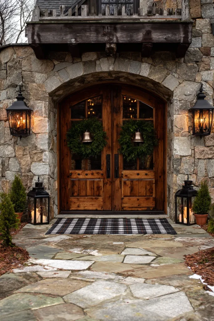 I just think this entrance is absolutely stunning and has such a high-end, timeless holiday look. The contrast between the ancient-looking, cool stone and the abundant warm light from the lanterns and the door windows is just magical, it makes you feel like you are stepping into a fairytale. Using the classic bells and simple wreaths keeps it very sophisticated while the outdoor lanterns bring that crucial cozy element. If you love drama mixed with deep, traditional holiday charm, this style is absolutely showstopping.
