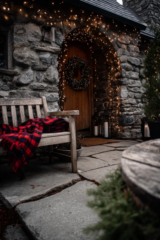 Picture this a sturdy stone cottage entrance that just screams cozy winter retreat. The rugged, natural stone facade gives off such a romantic old-world vibe perfectly contrasted by the warm glow of string lights tracing the arched doorway. A dark wooden door wears a classic wreath, and next to it, some tall black lanterns hold thick white pillar candles promising soft light when the sun goes down. On the left, a rustic wooden bench is draped with the most inviting red and black buffalo check throw a serious invitation to snuggle up. The flagstone path beneath looks perfectly worn and grounded adding to that charming, lived-in feel.