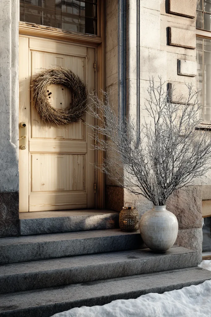 This entryway perfectly showcases a serene and sophisticated approach to winter decorating. The architecture features strong, handsome stone elements contrasted beautifully by a light, natural wood door that looks so inviting. A simple, rustic grapevine wreath hangs on the door adding texture without overwhelming the clean lines. Beside the heavy stone steps, a large, pale ceramic vase overflows with delicate, frosted branches creating an airy, sculptural focal point. A small woven lantern sits near the bottom step adding just a hint of warm, subtle light against the fresh snow resting below.
