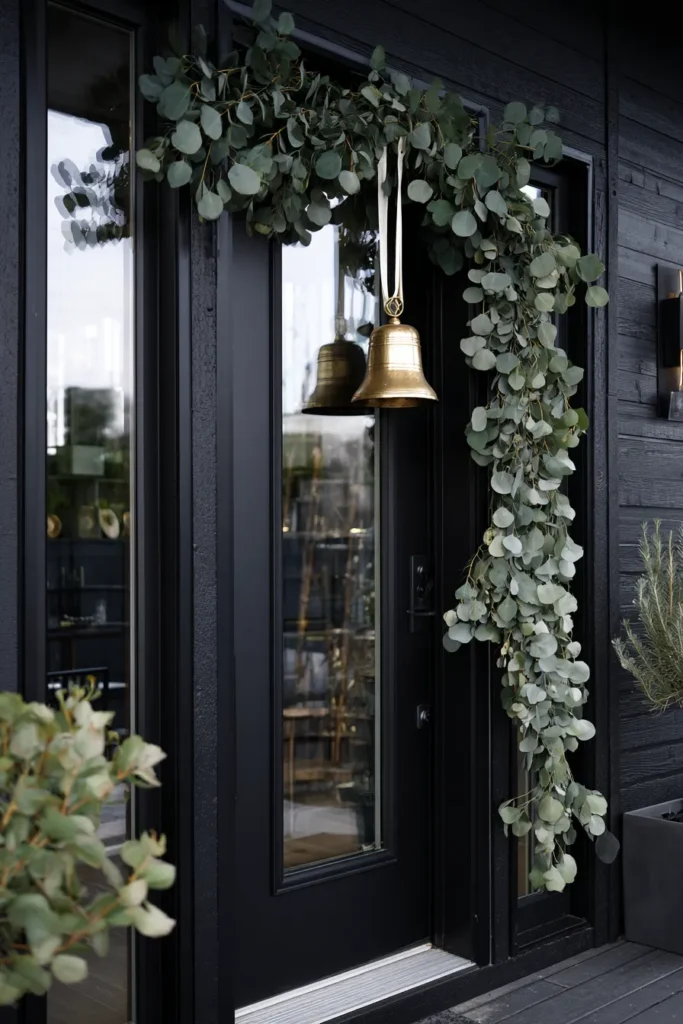 This entry features a very striking modern aesthetic dominated by dark siding and door frames giving it a sleek, contemporary look. The decoration leans into natural textures and forms for a subtle holiday statement. A lush swag of silvery green eucalyptus gracefully drapes over the doorway adding a wonderful organic curve that softens the sharp black lines. Hanging from a creamy ribbon is a single, large, polished brass bell which acts as the perfect metallic accent against the dark backdrop. A simple potted evergreen sits nearby suggesting winter greenery without cluttering the clean architectural style.