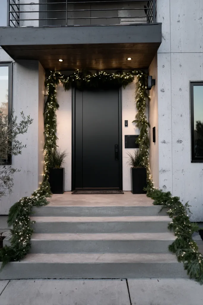 Oh my goodness, I am totally in love with this high-contrast holiday look. It takes that beautiful modern, clean architectural style and gives it the most wonderful festive hug. The way the tiny warm lights sparkle against that deep black door and the light grey concrete is just breathtakingly dramatic yet still feels so welcoming. It proves that you can keep your modern edge while still celebrating the season beautifully. I think this is such a sophisticated way to decorate your entry and it just makes me want to admire it all evening long.