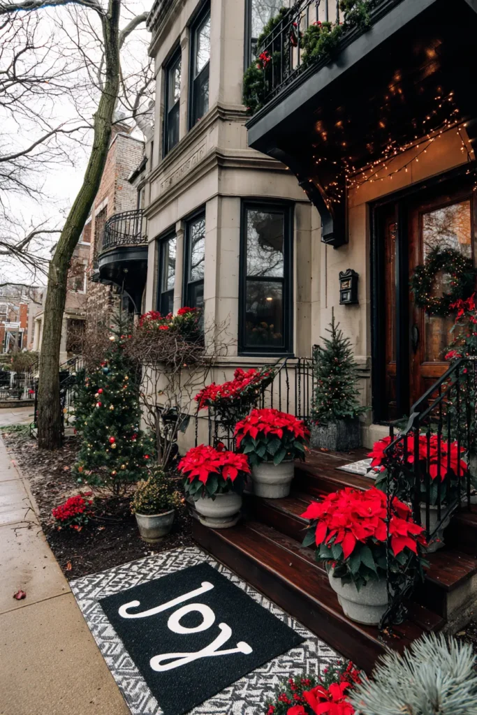 This entryway screams festive neighborhood charm with its beautiful, traditional architecture featuring light-colored stone and dark wood accents. The rich, dark wood stairs are layered with an abundance of vibrant red poinsettias set in classic light-colored pots which instantly draw the eye. A patterned black and white rug anchors the space with a cheerful “Joy” doormat welcoming guests. The upper balcony railing is decorated with a dark green garland interspersed with tiny red bows, and twinkling lights cast a warm glow over the whole scene.