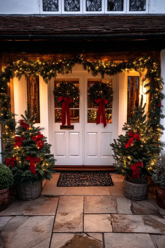 This charming entryway features a crisp white door flanked by lovely windows and set beneath a gently sloping roof. The architecture suggests a cozy cottage or perhaps a charming English home with its traditional structure. The decorations bring a vibrant holiday punch with rich green garlands generously strung with warm white lights framing the entrance. Two symmetrical potted evergreen trees tied with big velvet red bows flank the door, echoing the deep red bows adorning the matching holly wreaths hanging on the door panes. The whole scene sits on a lovely natural stone patio that glows softly in the ambient light.