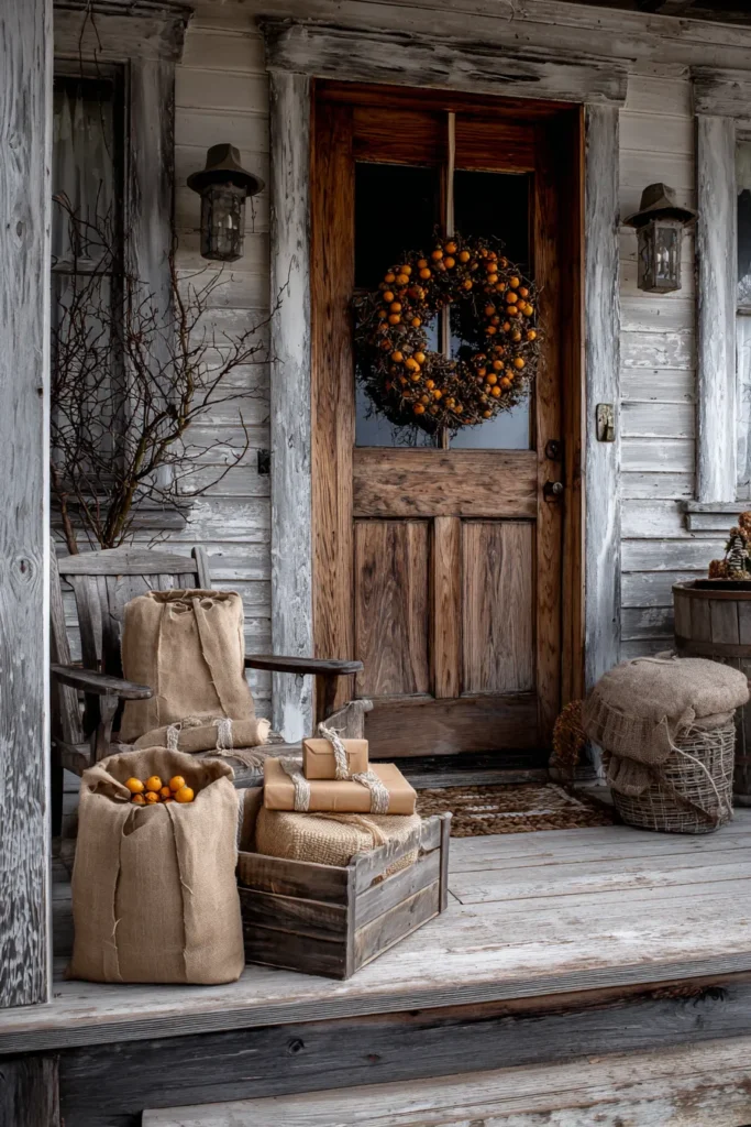 This porch has such a wonderful, weathered farmhouse aesthetic with its peeling light grey wood siding and rich, warm wood door. The decoration leans heavily into natural, earthy textures perfect for a late autumn or early winter welcome. A striking wreath made entirely of small orange berries hangs on the door, which complements the burlap sacks overflowing with similar fruit placed around the landing. Gifts wrapped simply in brown paper and tied with twine sit in a rustic wooden crate next to a weathered wooden chair, all adding to that charming, unpretentious country feel.