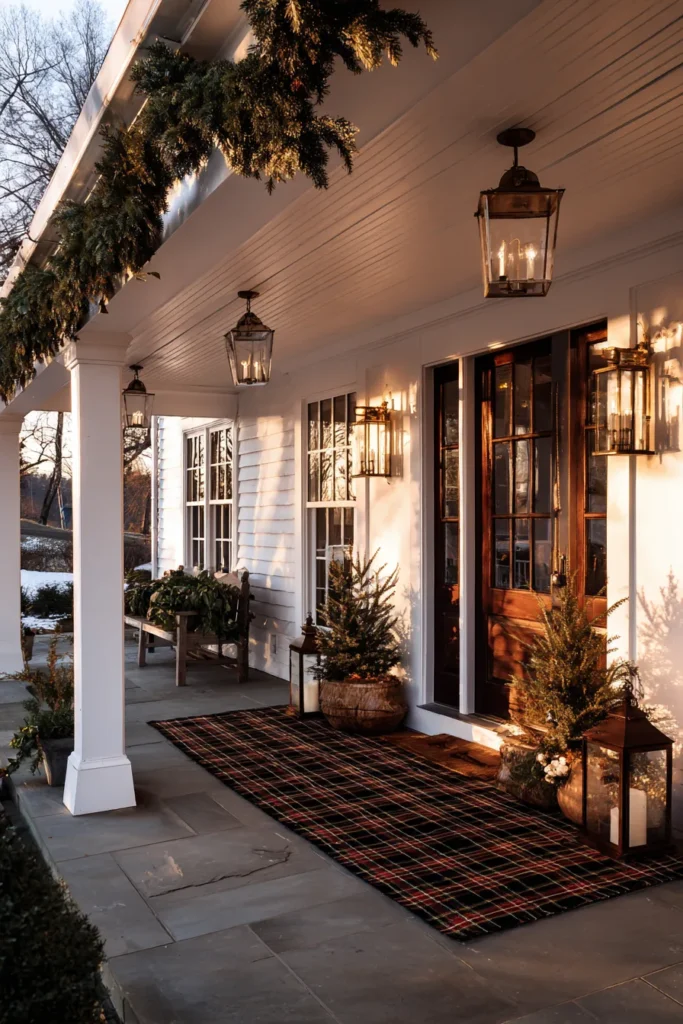 I absolutely adore the warm, golden hour light bathing this whole scene making everything look incredibly inviting. The deep jewel tones in that plaid rug are just the perfect anchor against the crisp white of the house. It feels so elegant and perfectly put-together for the season without feeling fussy at all. If you appreciate timeless style with a cozy, slightly masculine touch, this decor is pure inspiration. I want to bring that lantern glow right onto my own porch immediately.