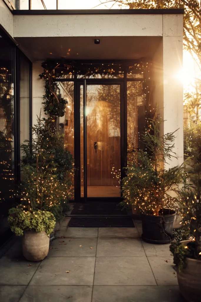 I am completely in love with the sheer glow happening here, it feels so peaceful and incredibly warm despite the modern exterior. The way the golden light catches the texture of the greenery and the potted plants is just divine. If you have a modern home but still want that unmistakable festive feeling this is pure gold. I think this setup is beautiful because it embraces simplicity and lets the warm light truly be the star of the show, making everyone feel instantly welcome.
