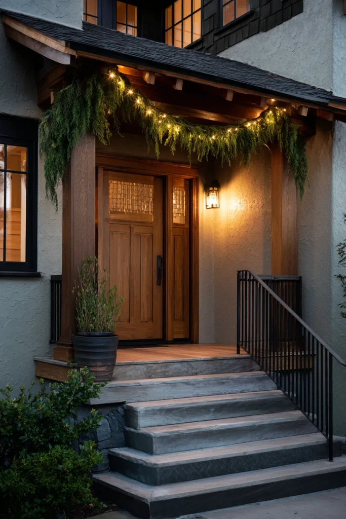 This entry has such a lovely, inviting Craftsman or perhaps rustic modern feel with its soft sage-toned stucco exterior and strong wood accents. The focal point is the beautiful warm wood double door with its divided lite glass panels, reflecting the interior light outward. The porch roof is supported by sturdy wooden posts, and underneath, a dramatic drape of long, weeping greenery intertwined with twinkling string lights creates an ethereal, cozy canopy. The grey stone steps and black metal railings provide strong, modern grounding lines for the organic decor.
