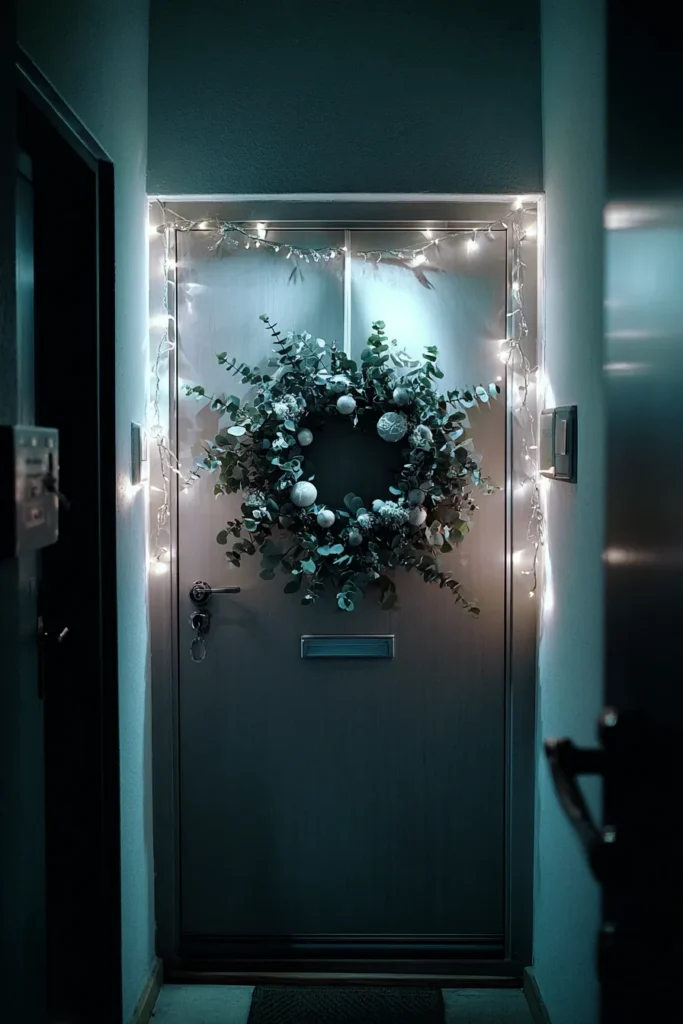 I find this whole look so incredibly chic and refreshingly different from the usual red and green overload. The cool white and blue tones against the simple grey door are so sophisticated and really suit a modern aesthetic. If you are someone who prefers subtle holiday decor that feels elegant and almost ethereal this is your perfect inspiration. I think this simple styling is beautiful because it still screams festive spirit while maintaining a very calm, contemporary vibe which I totally appreciate.
