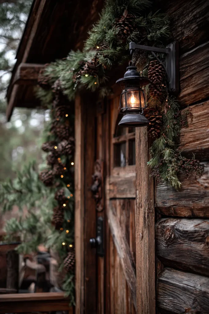 This entrance exudes a cozy, secluded cabin atmosphere thanks to the heavy, textured, dark-stained log siding and the warm wood door. The decoration focuses entirely on natural, woodsy elements creating a very organic holiday look. A thick garland made of pine branches and large, real pinecones frames the door and is subtly laced with tiny warm string lights. A handsome, dark metal wall lantern with a glowing faux candle illuminates the texture of the wood, enhancing the rustic charm. The setting looks slightly damp and moody perhaps on a quiet winter day in the woods.