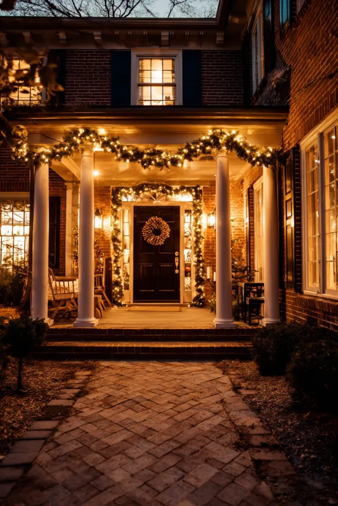 This traditional home entry boasts rich red brick architecture balanced by stately white columns supporting a covered porch. The dark front door is centered beneath the porch roof, which is elegantly draped with thick evergreen garland generously interwoven with abundant warm white string lights. Additional greenery frames the doorway and windows, and a natural twig wreath hangs centrally on the door. The brick walkway laid in a herringbone pattern leads right up to the porch steps, all warmly lit by the overhead lights and the warm glow spilling from the many windows.