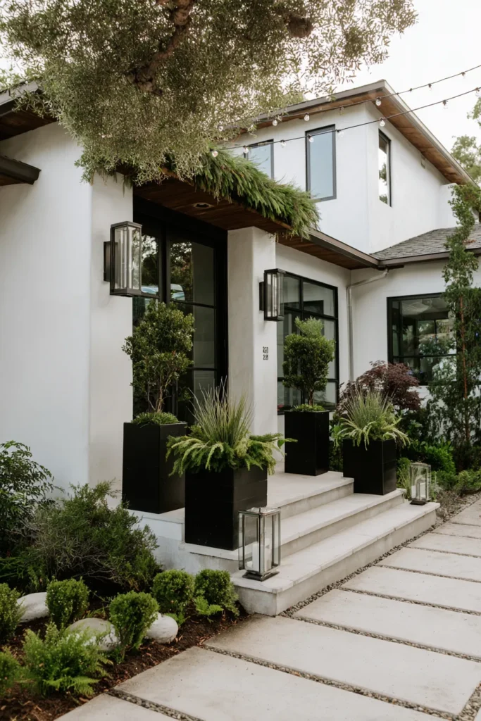 This entryway showcases a very contemporary home design featuring crisp white stucco walls and striking black-framed windows and doors. The clean, light-colored concrete steps lead up to the entrance which is sheltered by a simple wooden overhang. The decor keeps the modern, minimalist feel alive by relying on lush, textural greenery rather than traditional holiday colors. Ferns and various grasses spill vibrantly from tall, geometric black planters flanking the entryway, while a cascading green garland with string lights softens the lines above the door. Sleek, modern glass lanterns rest on the steps adding a subtle evening glow.