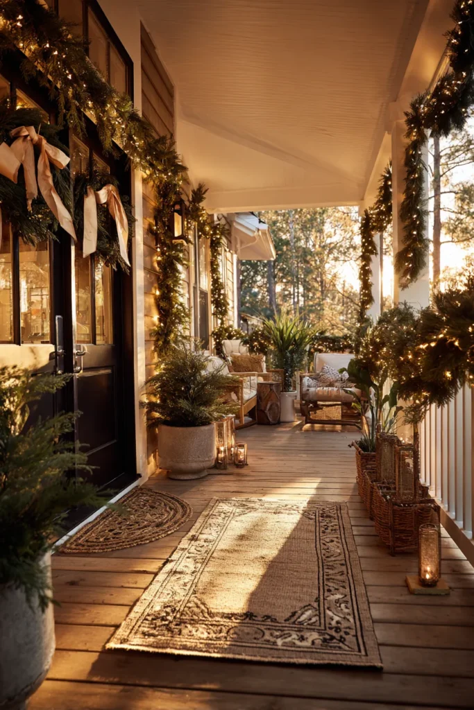 This inviting porch belongs to a home with warm wood siding and crisp white trim, giving it a lovely modern farmhouse or woodland retreat feel. The entire porch ceiling and entryway are adorned with thick evergreen garland that drapes beautifully and is illuminated by countless warm fairy lights. The dark front door features large glass panels decorated with wreaths tied with oversized, pale ribbon, creating a soft, romantic focal point. The wooden floor is layered with natural fiber rugs, and the space is filled with various potted evergreens and wicker baskets, all bathed in the golden hour glow.