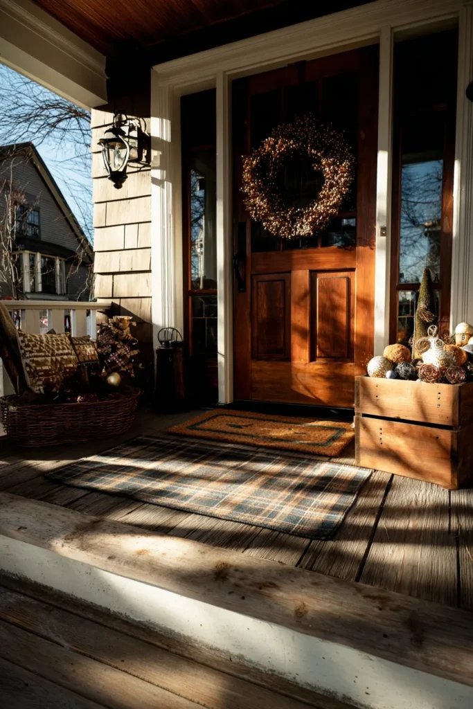 This charming porch has wonderfully aged, natural wood plank flooring and a rich warm wood door that looks wonderfully substantial. The siding appears to be light-colored cedar shakes, creating a lovely textured contrast to the smooth white trim. The decor embraces natural tones and textures with a prominent plaid runner rug layering over a woven coir mat right at the door. A large wicker basket on the left holds soft pillows and ornaments, while a wooden crate on the right is stacked high with decorative spheres in muted browns and creams. The door is topped with a beautiful, earthy wreath made of tiny dark berries or buds.
