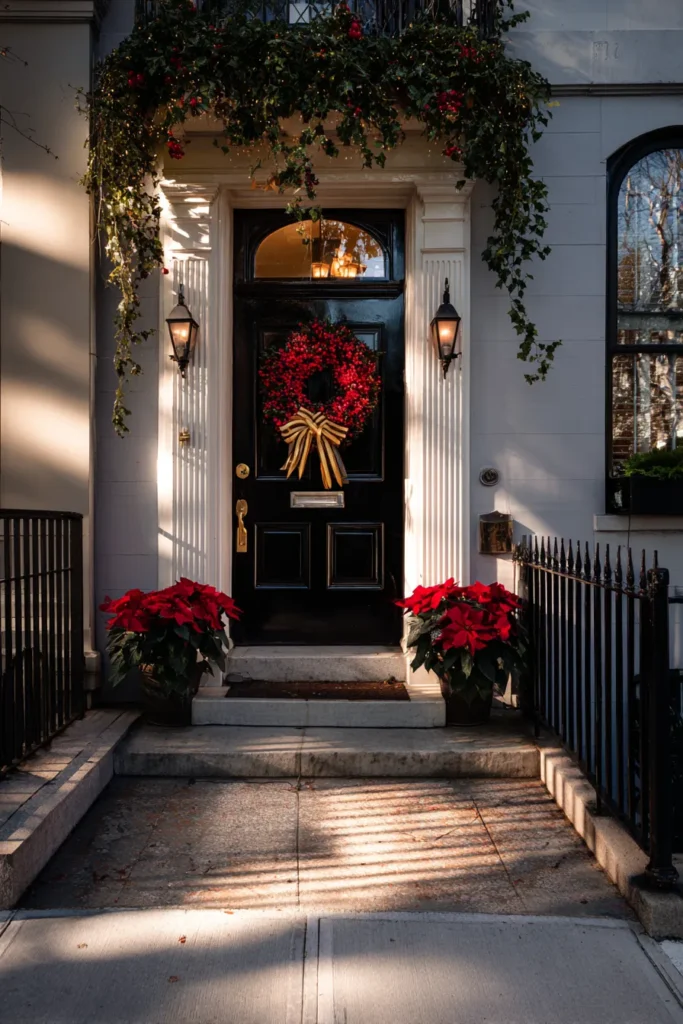 I am completely captivated by the crisp elegance of this whole setup. That rich red and gold against the black door and light exterior is just a showstopper and feels so perfectly coordinated. It has that wonderful formal holiday flair you see in classic city celebrations. I think this design is impressive because it uses such powerful color accents in a very balanced, symmetrical way that feels both grand and incredibly cheerful. It is the ultimate sophisticated Christmas greeting.