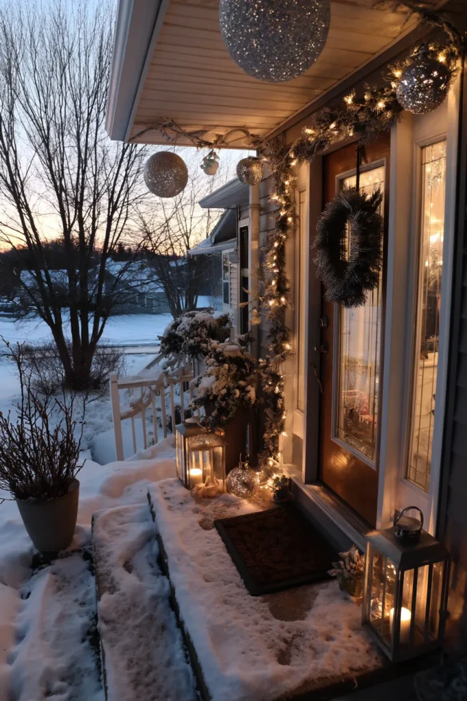 This cozy porch welcomes visitors with a beautiful snowscape and a stunning display of soft light against dark accents. The house itself features dark siding and a rich wood door flanked by sidelights, all covered by an overhanging porch roof. The decoration focuses on a cool-toned, wintry elegance using lots of light and silver. Twinkling white string lights and delicate icicle lights are heavily draped around the entryway columns and trim. A dark, textured wreath hangs on the door, complemented by large, silver sparkly orbs hanging from the porch ceiling and large lanterns with warm candlelight sitting in the snow.
