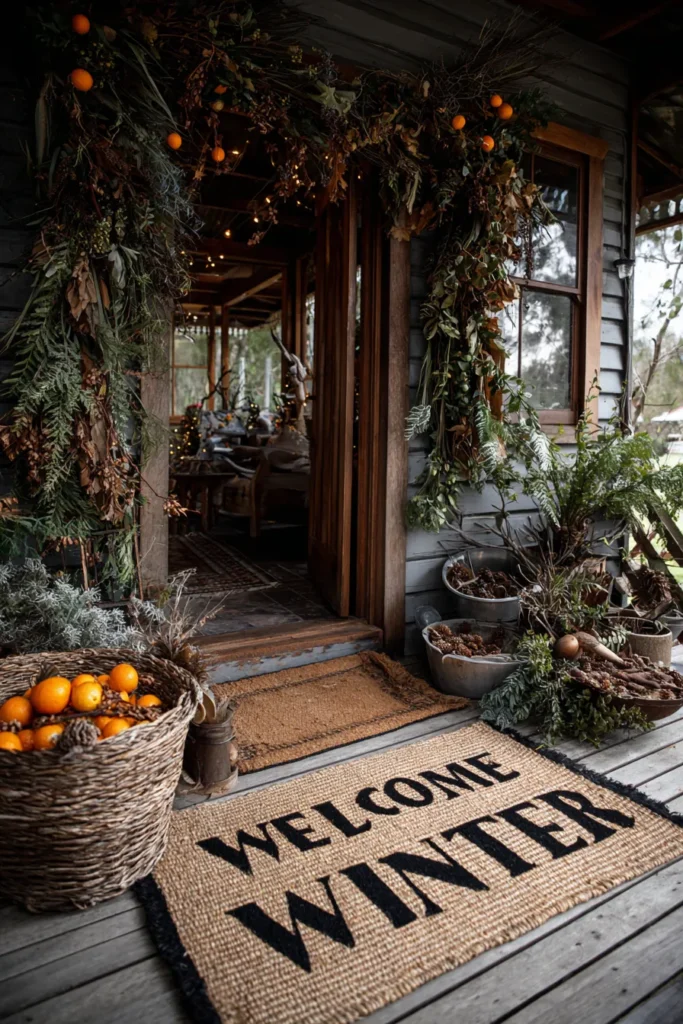 This entryway suggests a beautiful woodland home or cabin with rustic wooden siding painted a muted grey-blue and a rich natural wood door. The porch ceiling overhang is beautifully framed with an incredibly lush, textural garland made from deep greens, dried foliage, and pops of bright orange fruit that look like miniature mandarins or persimmons. Natural elements abound with woven baskets filled with the same bright oranges and large metal tubs brimming with pinecones and dried branches. The door sits on a warm wooden deck accented by a jute doormat that cheerfully reads Welcome Winter.