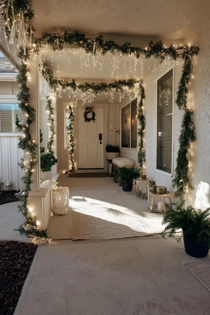 I absolutely adore this light and airy approach to winter decorating. It feels so magical, almost like a gentle snowfall caught in the lights. If you prefer cool-toned white lights and want a look that feels fresh and sparkling this is total goals. I think this design is impressive because it uses light so effectively to transform the whole porch into an enchanting little winter wonderland without needing heavy traditional colors. It looks like something right out of a sweet holiday movie.