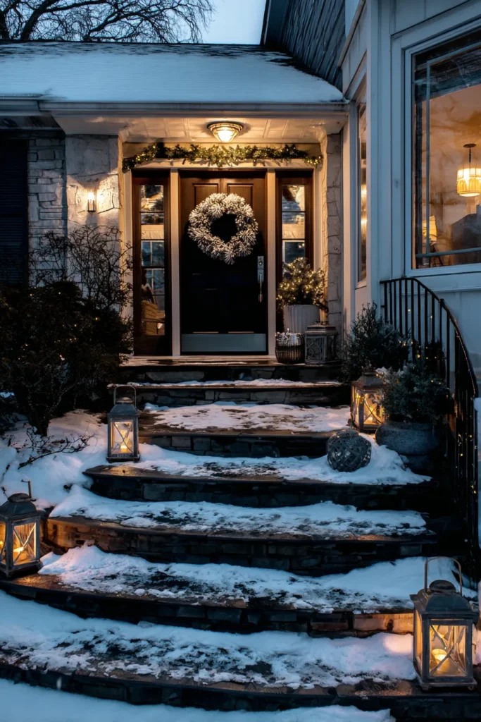I am completely charmed by how bright and ethereal this snowy scene looks at dusk. The combination of the cool blue twilight and the warm white lights against the dark door is just pure holiday magic. I think this look is so impressive because it embraces the snowy setting and leans into a silvery, icy theme that feels both festive and incredibly peaceful. If you dream of a white Christmas entrance, this combination of warm candlelight and cool sparkle is just perfect.