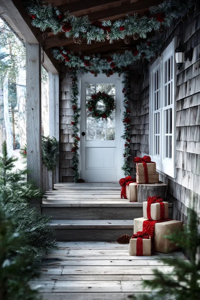 I am totally obsessed with how chic and calm this setup feels. It’s proof that you don’t need tons of bright colors or flashy lights for an impressive holiday greeting. The restrained palette of soft wood, cool stone, and silvery white branches is just so elegant and very much giving me sophisticated Nordic vibes. I think this look is just stunning because it embraces the quiet beauty of winter while still feeling special and perfectly decorated for the season. It’s honestly my kind of holiday welcome.