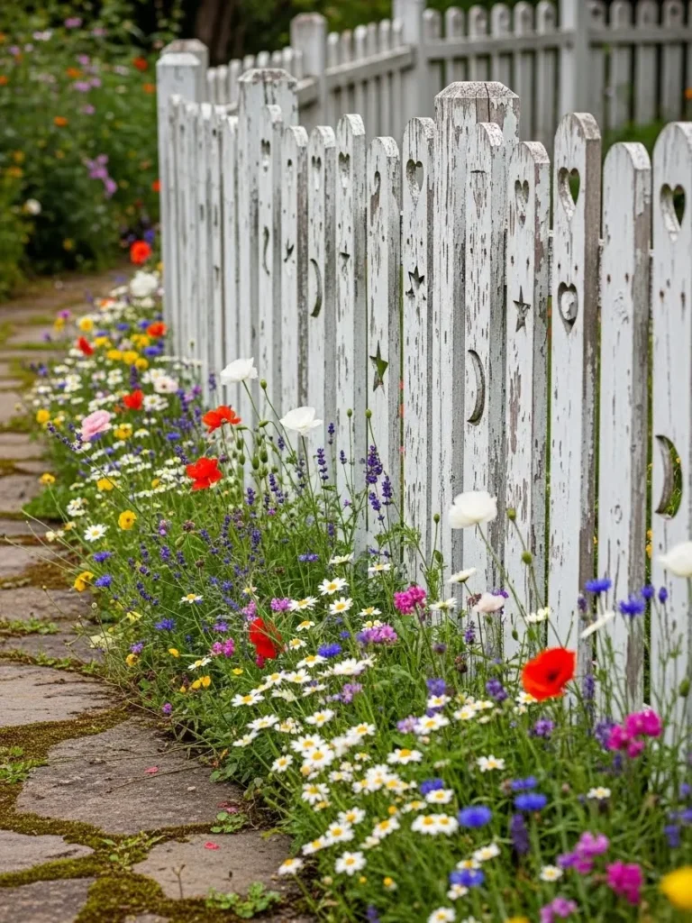 This aged white picket fence shows off chippy paint and natural wear that adds instant character. Wildflowers growing along the base soften the structure and bring in pops of color. The result feels relaxed, romantic, and perfectly imperfect.