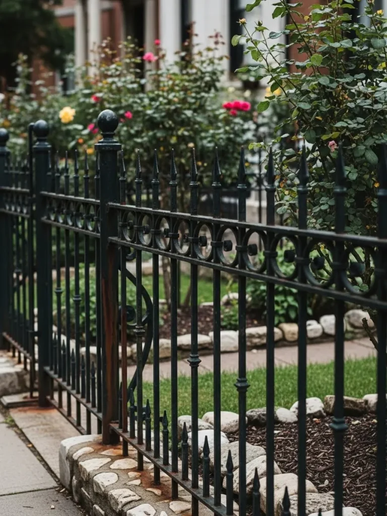 Elegant Black Iron Fence With Garden Detail