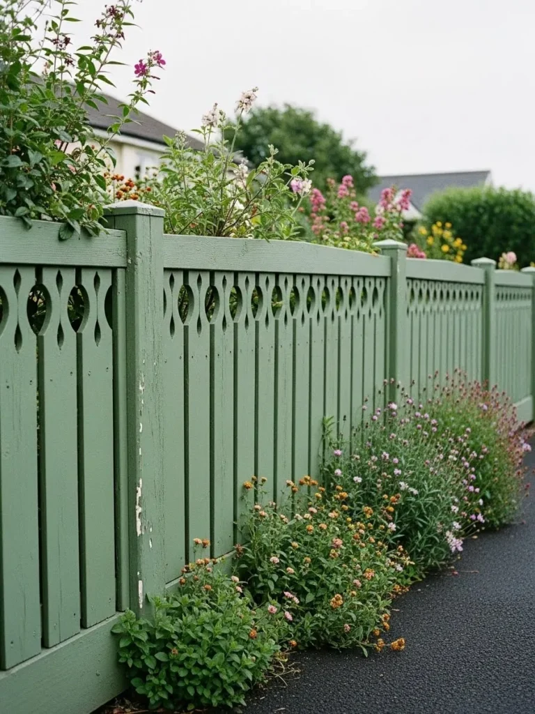 This sage green fence has a sweet, almost storybook feel with its vertical boards and subtle cutout details near the top. The color blends gently with the surrounding greenery, making the fence feel like part of the garden rather than something separate from it. Flowering plants climbing and spilling along the base make the whole scene feel relaxed and lived in.