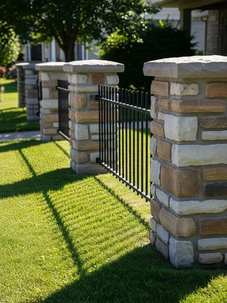 This fence design combines sturdy stone pillars with simple black iron panels for a look that feels both classic and upscale. The contrast between the textured stone and the sleek metal adds depth, while the low height keeps the yard feeling open and friendly. Sunlight casting shadows through the iron makes the whole setup feel dynamic and lively.