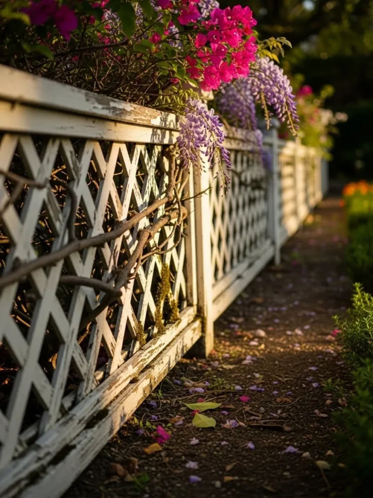 This fence uses a lattice pattern that feels airy and decorative, especially with flowering plants weaving through it. The light color keeps it bright and soft, while the repeating design adds just enough detail to make it special. Fallen petals and greenery around the base make it feel like part of a blooming garden moment.